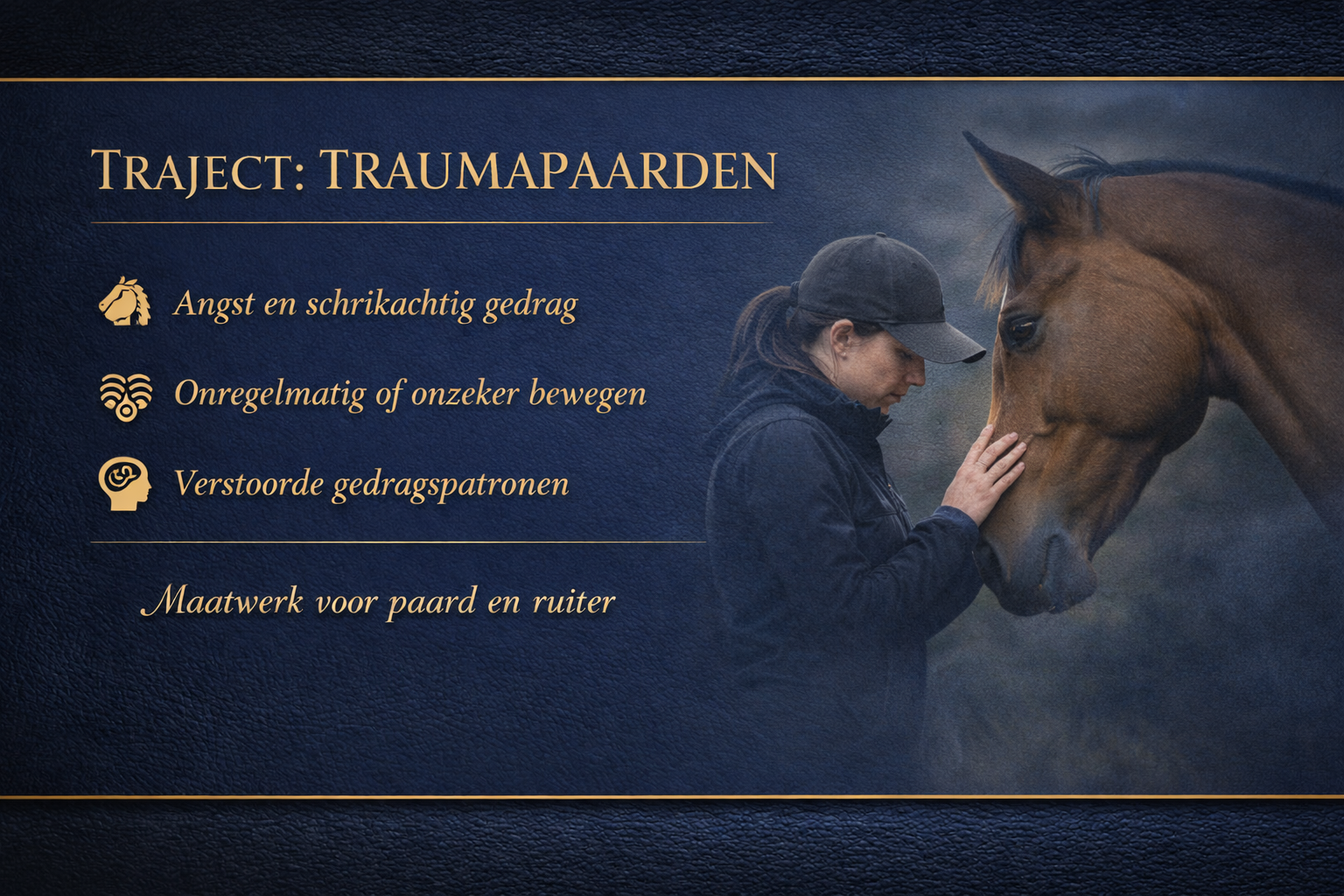 Voor paarden met angst, schrikgedrag, onzekere en onregelmatige beweging, of een verstoord gedragspatroon. Wij bieden de ondersteuning die nodig is om het trauma te verwerken en het paard weer in balans te brengen. Dit resulteert in een gelukkig paard, een betere band en een dieper inzicht in hun specifieke behoeften.